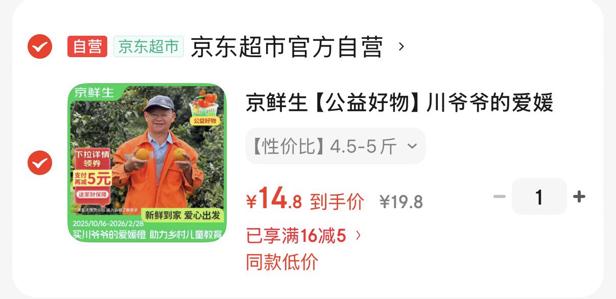 京鲜生爱媛38号果冻橙 拍下14.8亓 净重4.5-5斤好单发报员2025年12月30日 15:180举报 京鲜生爱媛38号果冻橙拍下14.8亓 净重4.5-5斤https://u.jd.com/AOpdr5Y 复制文案