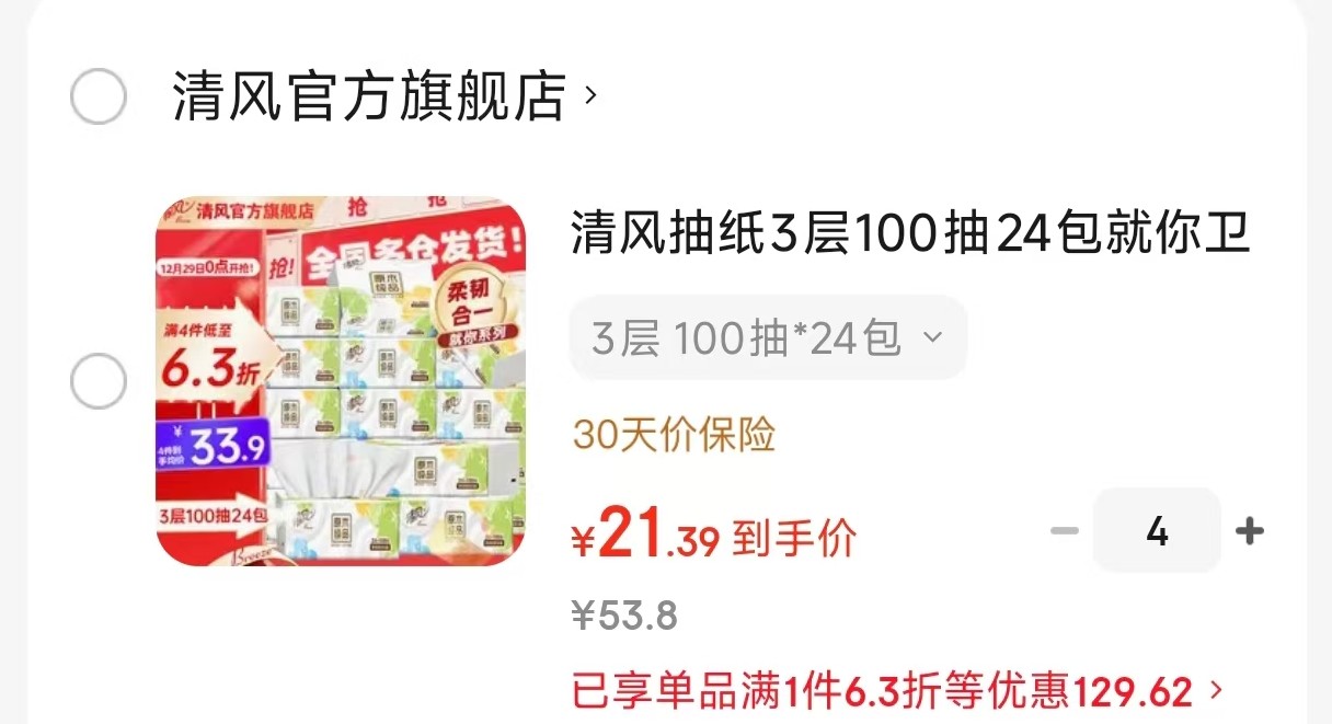清风 抽纸3层100抽24包,拍4件【87.6】折0.8/件