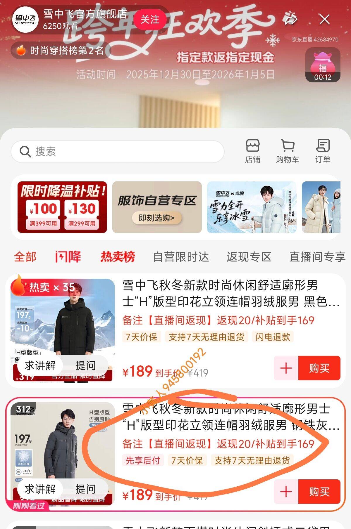 雪中飞 连帽长款羽绒服,右上角进直播间备注返20到手169