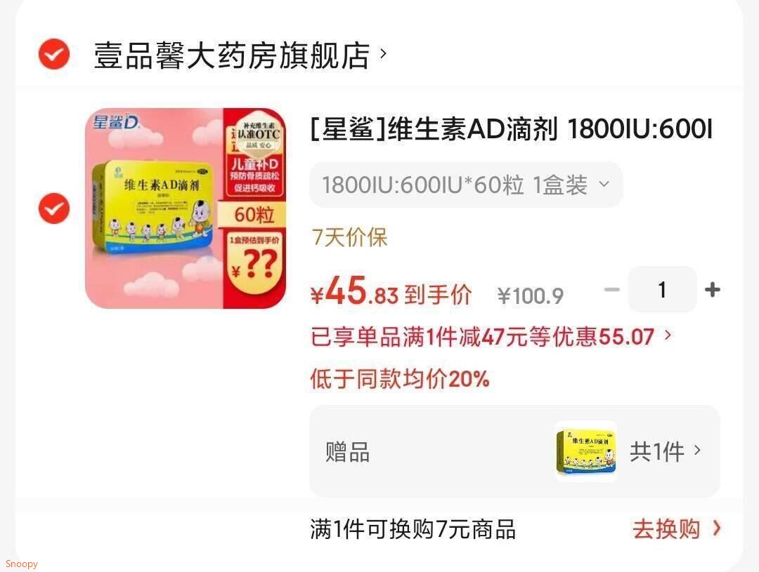 0.38元/粒!抓紧冲! 星鲨 维生素AD滴剂60粒 拍1赠1共2盒45.83元!好单发报员2025年12月30日 18:510举报 0.38元/粒!抓紧冲!星鲨 维生素AD滴剂60粒https://u.jd.com/A6pUtHm 拍1赠1共2盒45.83元!这款是OTC的 孩子放心吃~复制文案