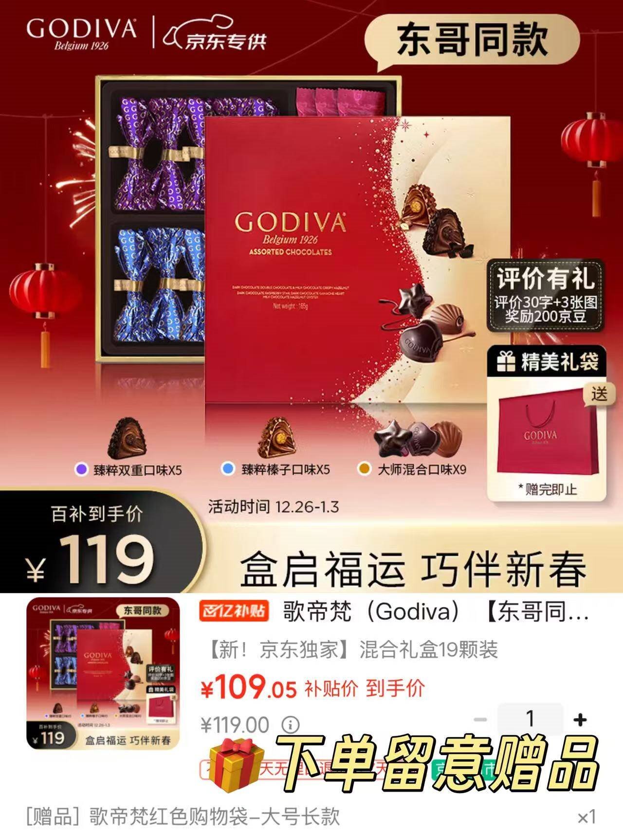 东哥同款安排 歌帝梵 经典巧克力19颗165g 119亓自营包邮,新客减4亓 好单发报员 2025年12月31日 13:37 0 举报 ——东哥同款安排——歌帝梵 经典巧克力19颗165ghttps://u.jd.com/ADZv2rs119亓自营包邮,新客减4亓*plus低至109亓 随单赠礼袋*5大风味 1盒尽收 囤上尝尝 复制文案