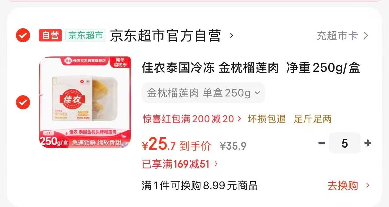 佳农 泰国冷冻 金枕头榴莲肉 单盒装 250g/盒,拍5件 折25.7/件