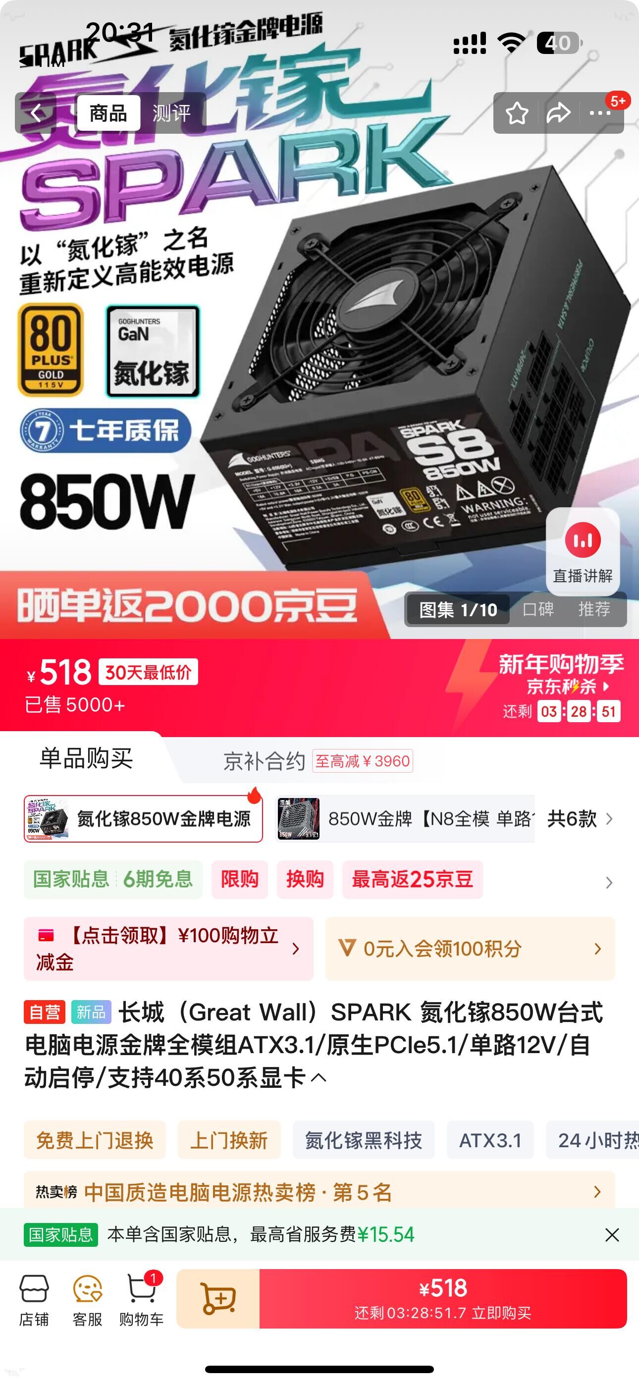 498 晒返20 长城氮化镓电源850W ,