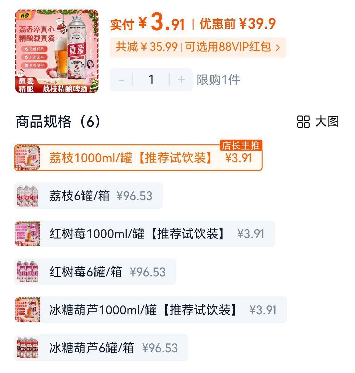 手慢无,3亓 真爱全麦精酿啤酒荔枝1000ml