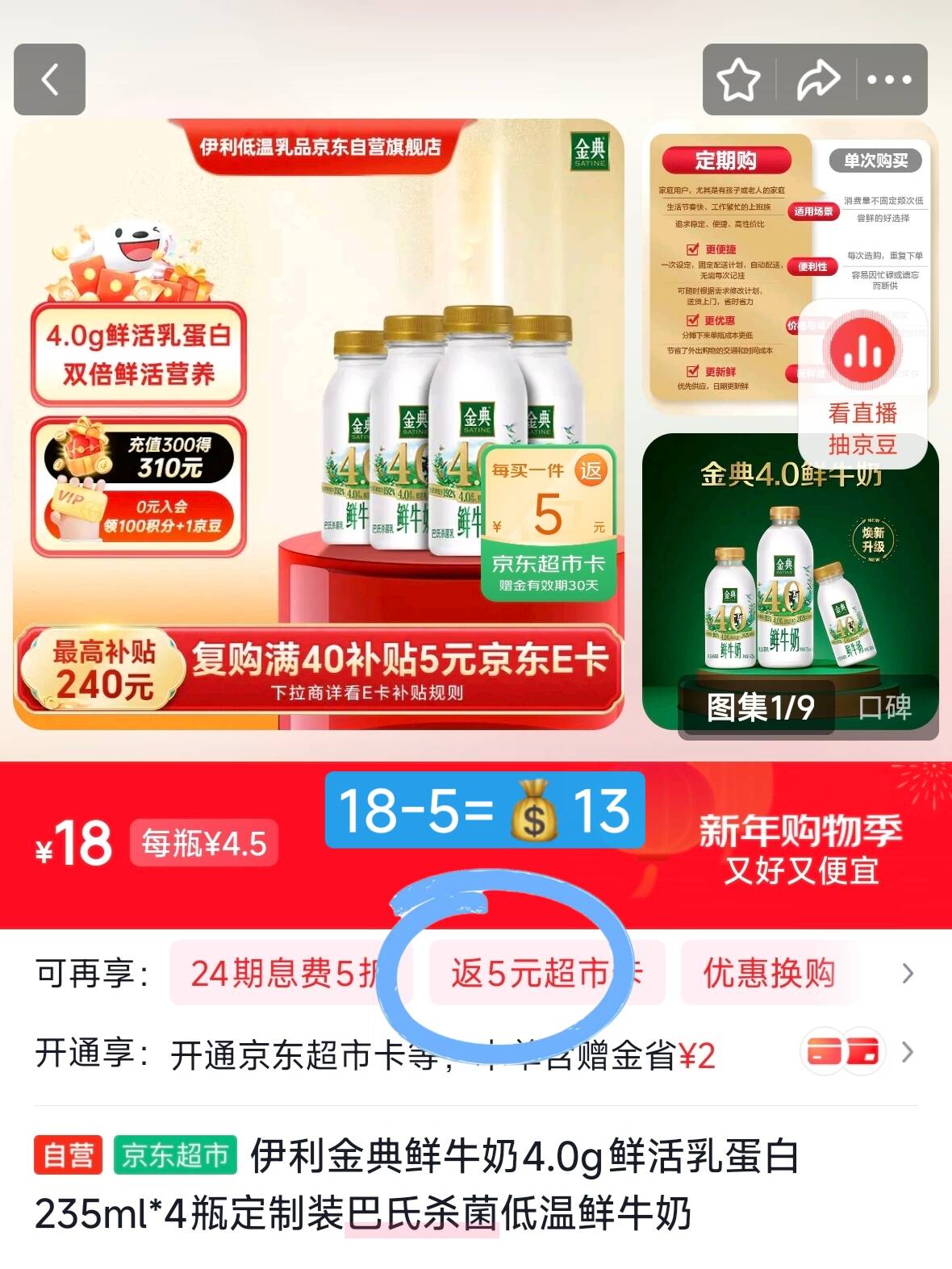 伊利金典鲜牛奶4.0g高蛋白 235ml*4瓶,3.2一瓶! 付18反5超市卡=13亓好单发报员2026年01月04日 17:340举报 伊利金典鲜牛奶4.0g高蛋白235ml*4瓶,3.2一瓶!付18反5超市卡=13亓https://u.jd.com/Ar9OMqz复制文案