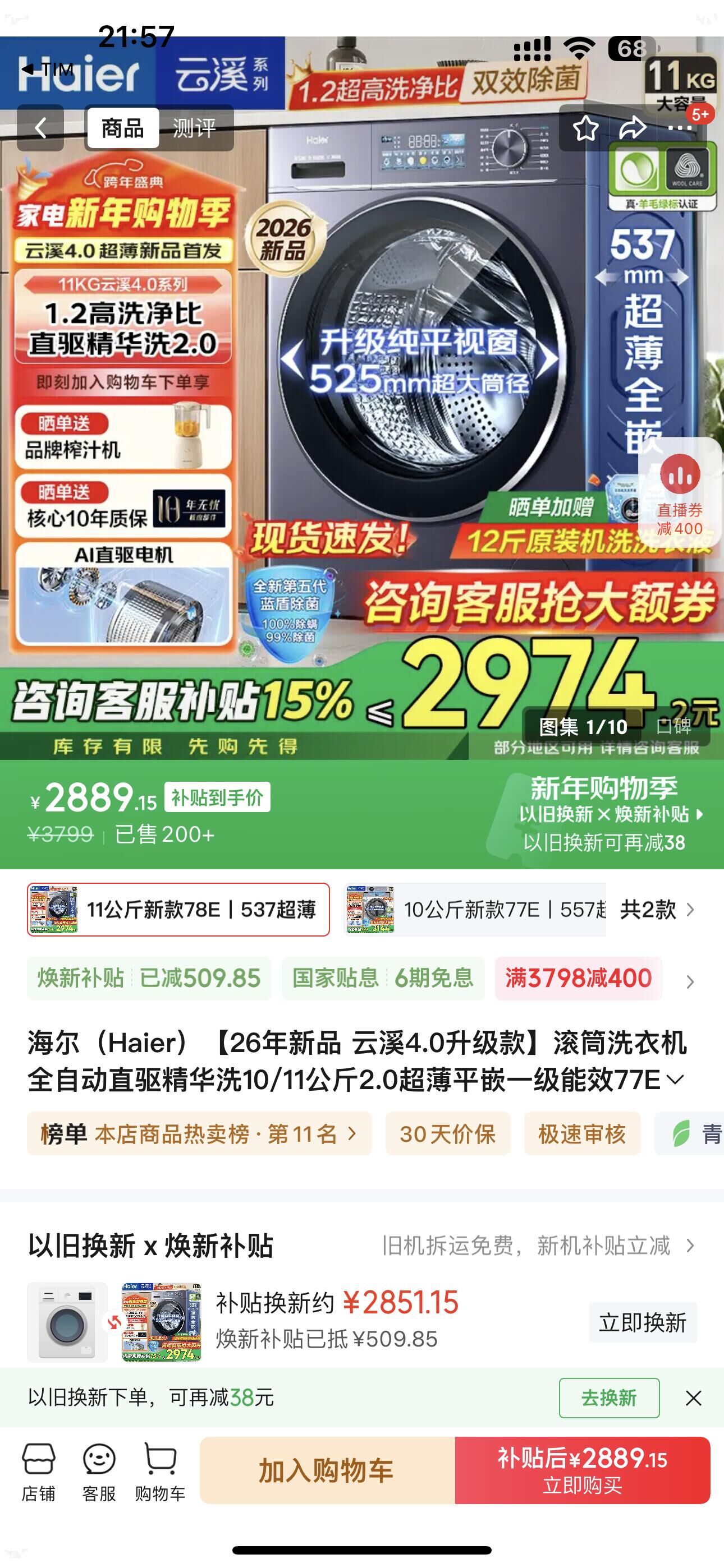 海尔云溪4.0升级款滚筒洗衣机全自动直驱11kg ,
