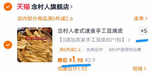 1.9亓/包拍5件=9.9亓 念村人 手工豆腐皮80g*5包 健康低脂的豆皮谁不爱!囤上好单发报员2026年01月04日 22:180举报 1.9亓/包拍5件=9.9亓【念村人】手工豆腐皮80g*5包https://m.tb.cn/h.770O8HU健康低脂的豆皮谁不爱!囤上火锅,凉拌,烧菜,多种神仙吃法复制文案