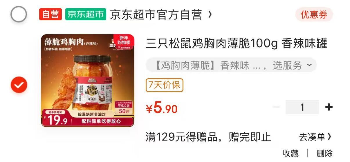 部分地区 三只松鼠 鸡胸肉薄脆100g,5.9 好单发报员 2026年01月04日 22:45 0 举报 部分地区三只松鼠 鸡胸肉薄脆100g,5.9https://u.jd.com/AgUlsru 复制文案