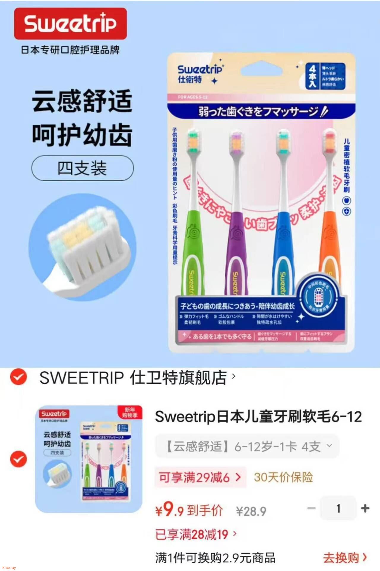 9.9元包邮! Sweetrip 儿童软毛牙刷 4支 牙齿更干净 适合6-12岁孩子 好单发报员 2026年01月05日 14:21 0 举报 9.9元包邮!Sweetrip 儿童软毛牙刷 4支https://u.jd.com/A6kma73 牙齿更干净 适合6-12岁孩子 复制文案