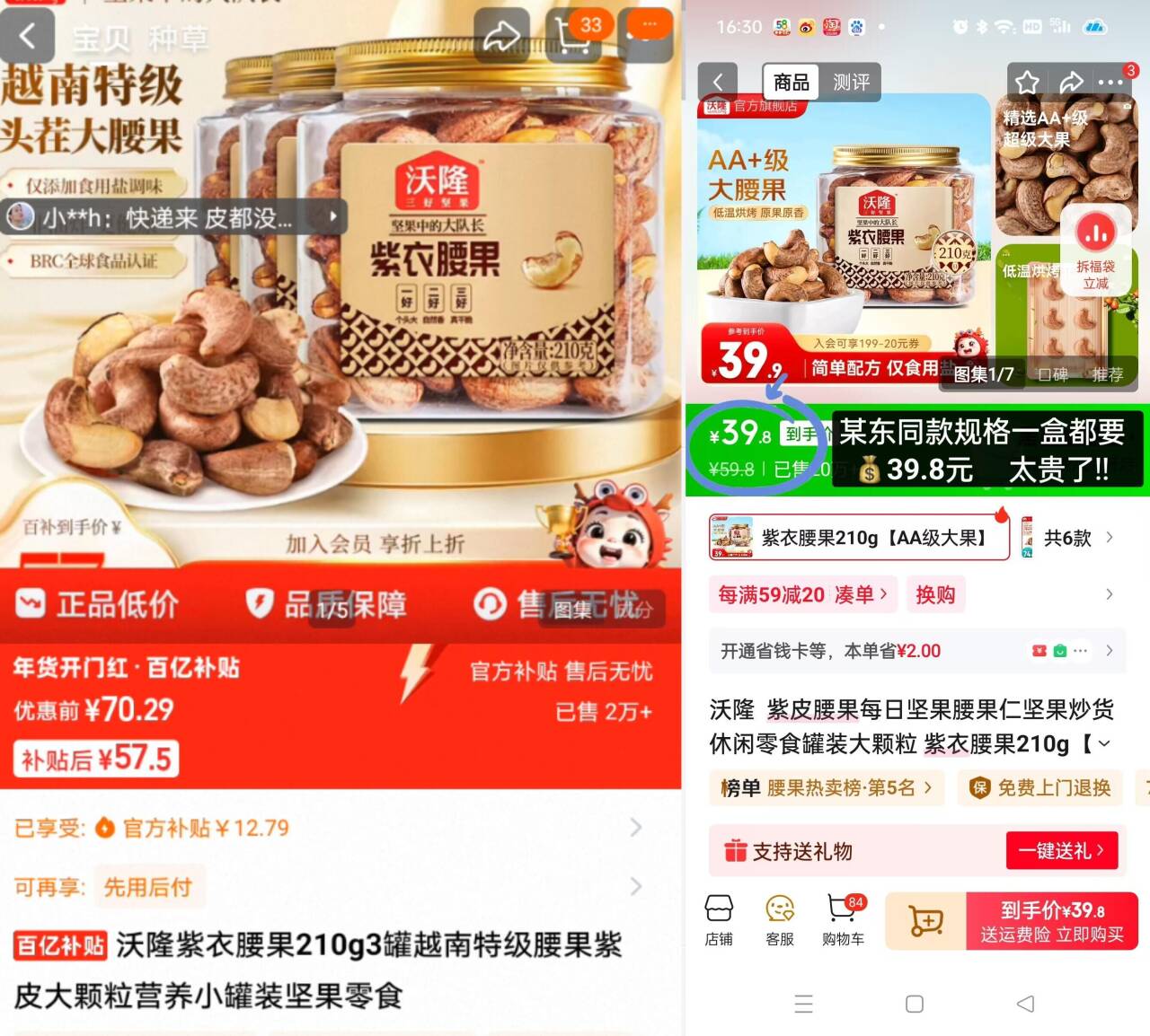 57.5亓限时百亿专属 沃隆 紫衣腰果210g*3罐 如圿格不对 下拉详情拍好单发报员2026年01月07日 00:510举报 57.5亓限时百亿专属【沃隆】紫衣腰果210g*3罐如圿格不对 下拉详情拍https://m.tb.cn/h.7RyeIJ2某东同规格一罐就30 复制文案