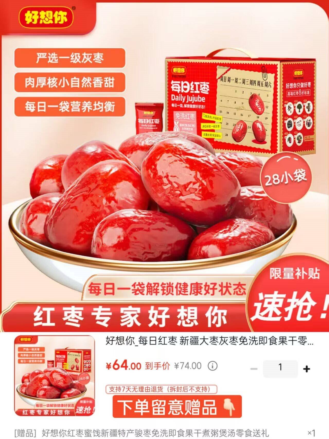红枣礼盒发車 好想你 每日红枣礼盒840g/箱 64亓,赠和田红枣礼盒840g好单发报员2026年01月07日 08:380举报 ——红枣礼盒发車——好想你 每日红枣礼盒840g/箱https://u.jd.com/A1mCyvf64亓,赠和田红枣礼盒840g*免洗即食 锁鲜小袋 送礼也赞复制文案