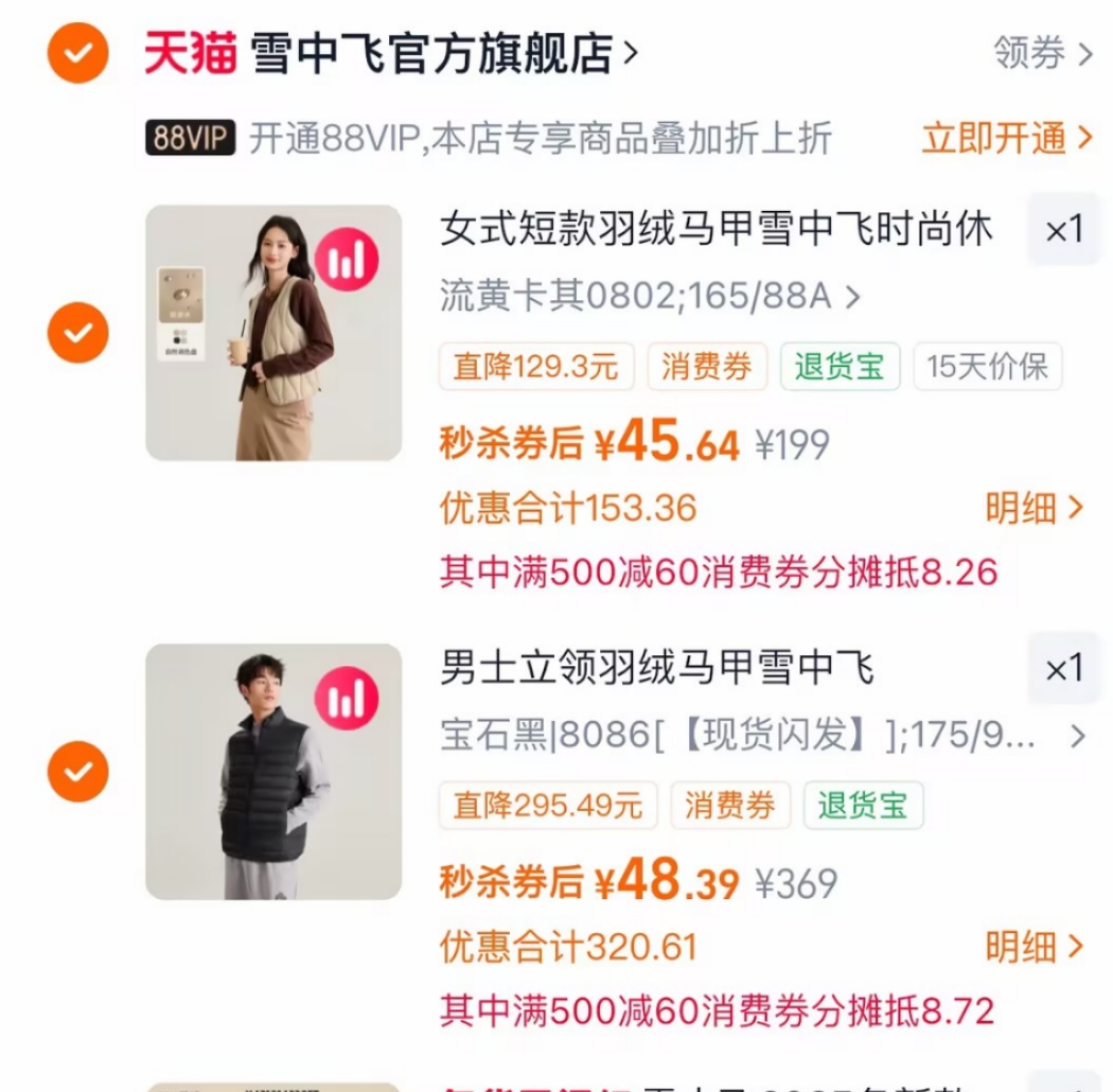 3.若第一步领到了消费卷 -- 复制本条消息去淘宝 凑消費劵好单发报员2026年01月07日 10:550举报 3.若第一步领到了消费卷--复制本条消息去淘宝 凑消費劵用袜子凑N件 选最后一个选项https://m.tb.cn/h.7iyTeEz-女款羽绒马甲45 男款的48复制文案