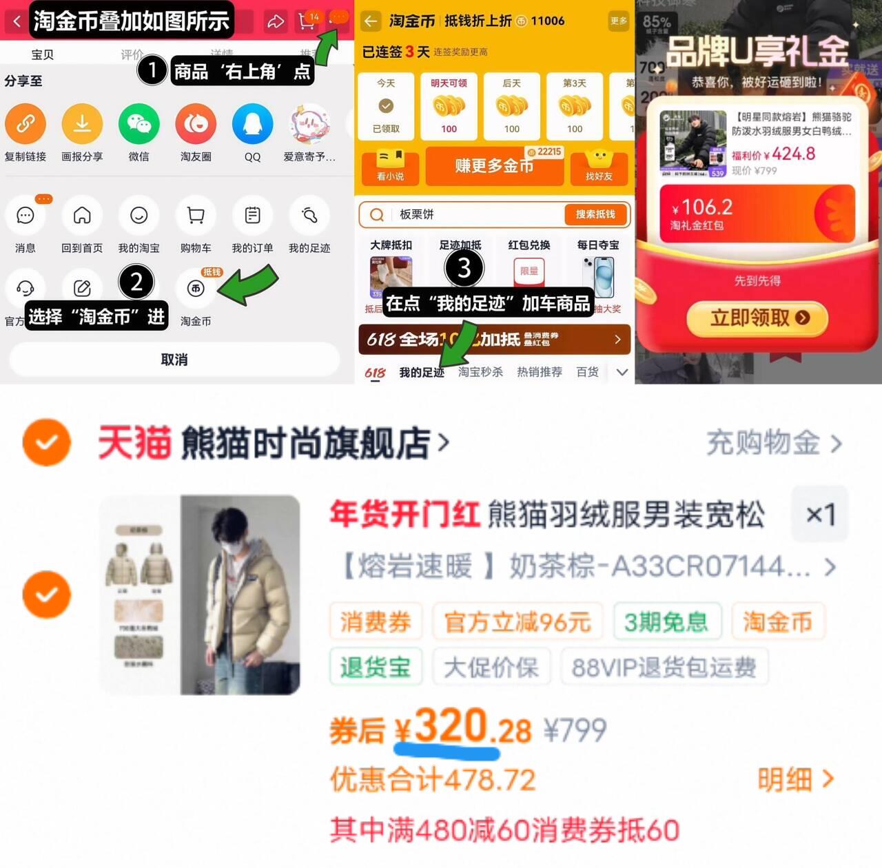 88vip320亓无券叠礼金 24金币 拍下赠熊猫大容量双肩包 熊猫 骆驼防泼水羽绒服好单发报员2026年01月07日 11:430举报 88vip320亓无券叠礼金 24金币拍下赠熊猫大容量双肩包【熊猫】骆驼防泼水羽绒服1、需叠88vip480-60消费券2、如图右上角叠“淘金币”拍下https://m.tb.cn/h.7iznZYO复制文案
