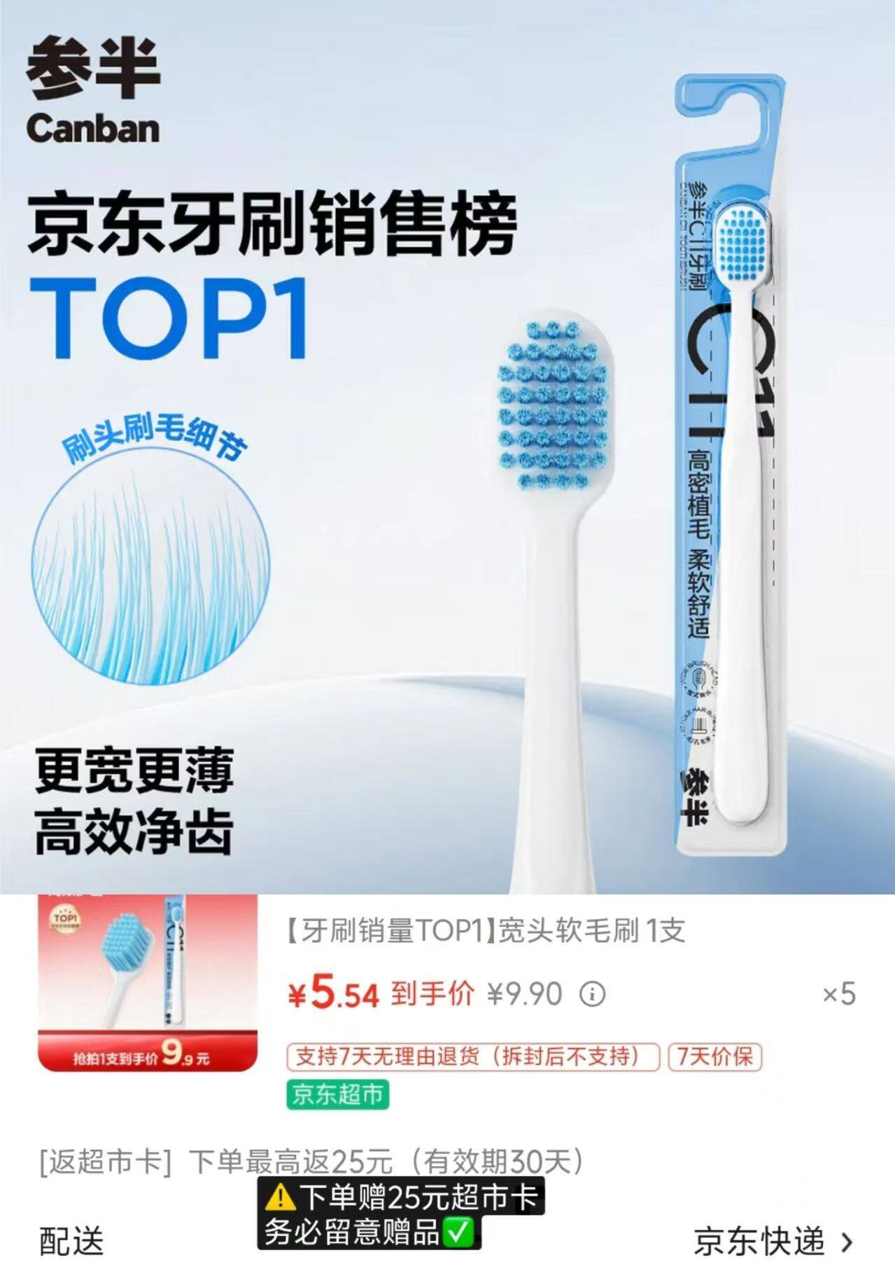 冲参半牙刷shen車 自营 参半 宽头软毛牙刷1支 买5件27.7亓包邮,限时包邮好单发报员2026年01月07日 16:340举报 ——冲参半牙刷shen車 ——【自营】参半 宽头软毛牙刷1支https://u.jd.com/A1hvPii买5件27.7亓包邮,限时包邮*反25亓超.市卡 牙刷才0.5/支复制文案