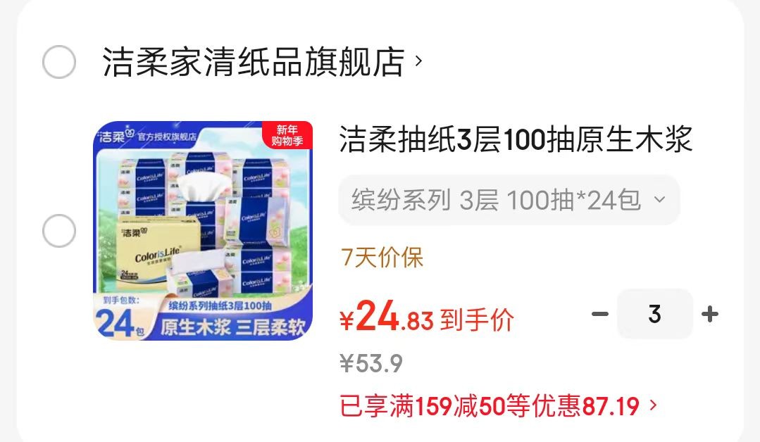 洁柔 抽纸3层100抽原生木浆 100抽*24包,拍3件【74.5】