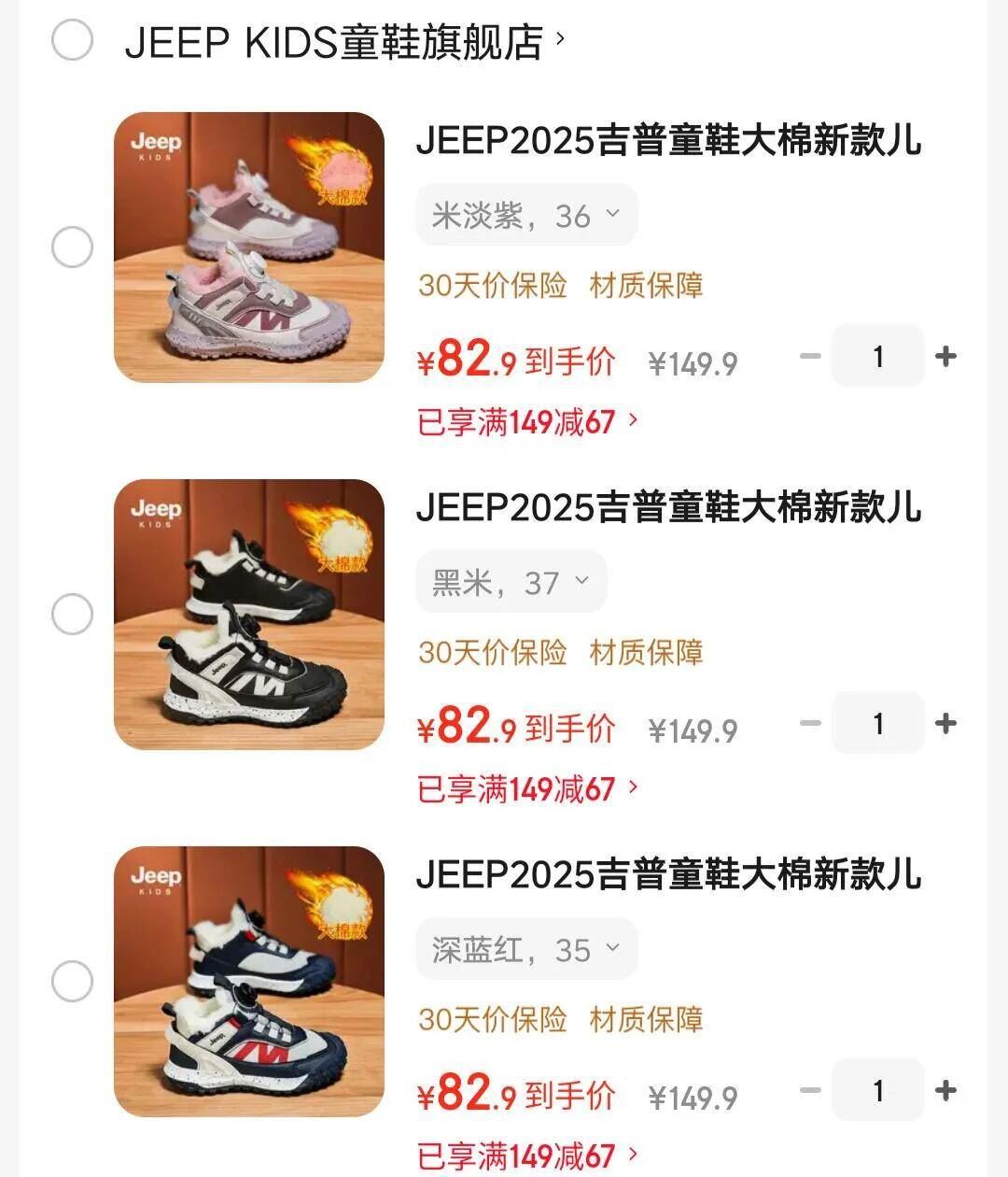 82.9元 夹棉加厚好价! Jeep 儿童冬季纽扣加绒棉鞋运动鞋 3色可选 男孩女孩都适合~好单发报员2026年01月07日 18:170举报 82.9元 夹棉加厚好价!Jeep 儿童冬季纽扣加绒棉鞋运动鞋https://u.jd.com/ADhkxYX 3色可选 男孩女孩都适合~复制文案