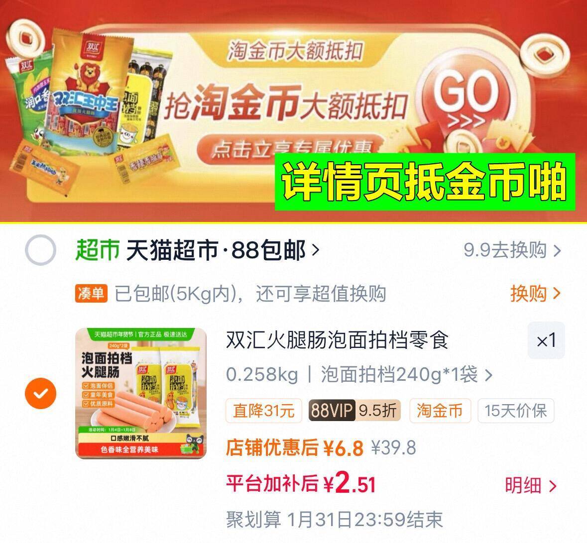 下拉详情拍!88vip2.5亓 双汇火腿肠泡面拍档香肠240g好单发报员2026年01月08日 15:500举报 下拉详情拍!88vip2.5亓双汇火腿肠泡面拍档香肠240ghttps://m.tb.cn/h.785bU3V复制文案