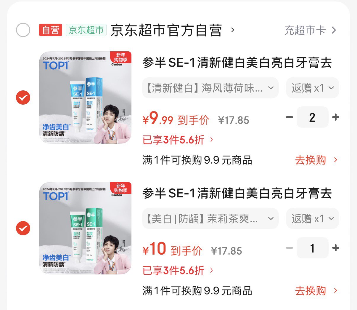 参半SE-1清新健白牙膏180g 任选3件29.9亓 反15超市卡 到手14.9亓 折4.9亓/支 好单发报员 2026年01月08日 17:20 0 举报 参半SE-1清新健白牙膏180g任选3件29.9亓 反15超市卡到手14.9亓 折4.9亓/支https://u.jd.com/EaCUg3u https://u.jd.com/EDCN8Uh 复制文案
