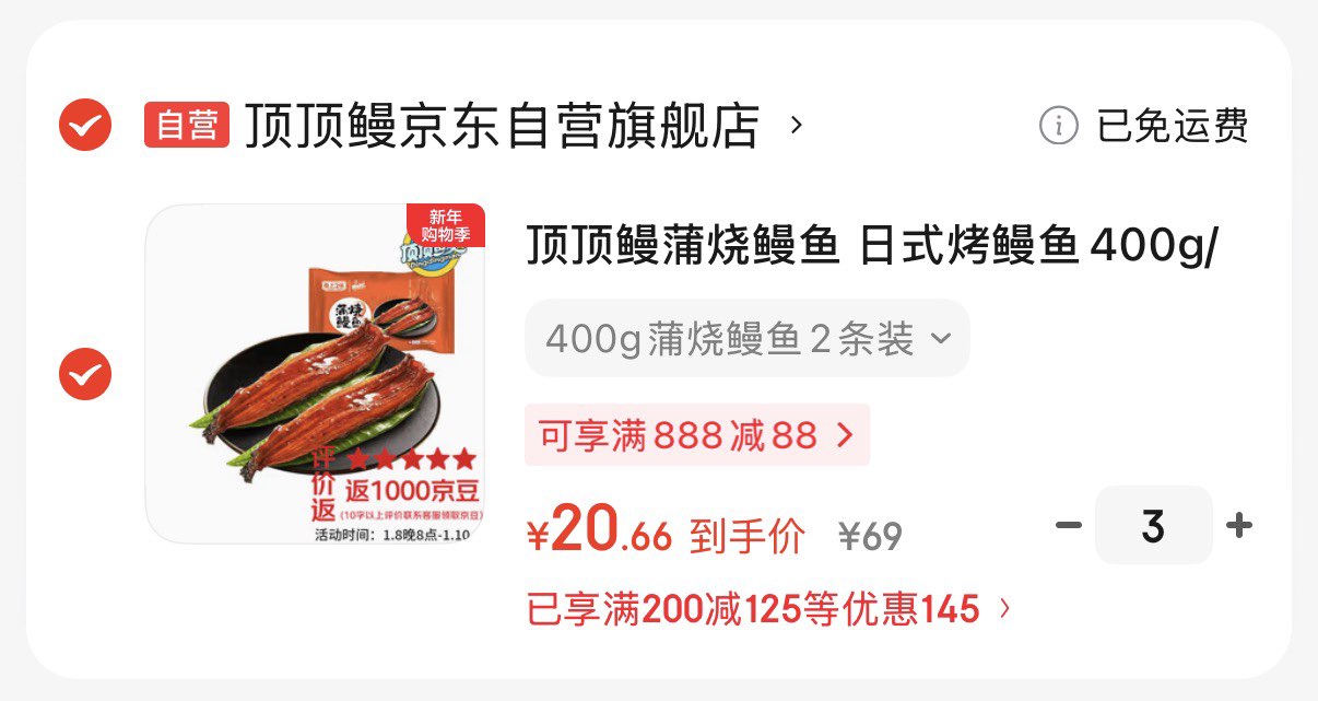 顶顶鳗蒲烧鳗鱼400g/袋*2条