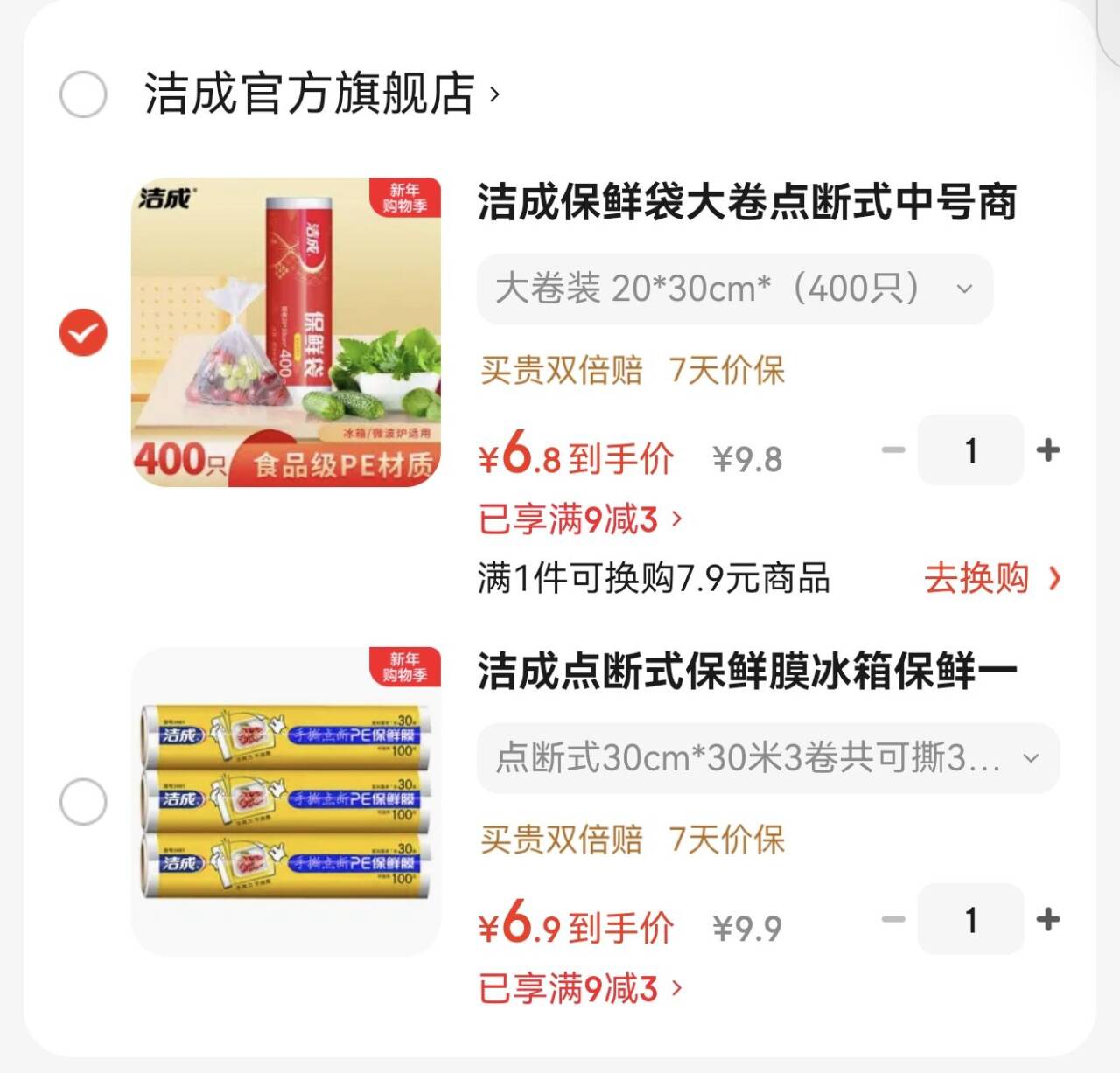 洁成保鲜袋合集 - 点断式手撕袋400只6元.8好单发报员2026年01月10日 08:440举报 洁成保鲜袋合集-点断式手撕袋400只6元.8https://u.jd.com/E6s8zqR点断式冰箱保鲜膜食品级30cm*30米3卷6元.9https://u.jd.com/E1sZbl4复制文案