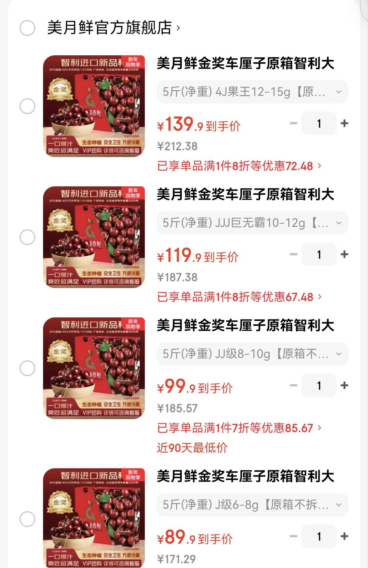 美月鲜金奖车厘子原箱 净重原箱五斤,带箱6斤 -好单发报员2026年01月13日 10:490举报 美月鲜金奖车厘子原箱净重原箱五斤,带箱6斤https://u.jd.com/E1gLYTB-1J级=89.9元2J级=99.9元3J级=119.9元4J级=139.9元复制文案