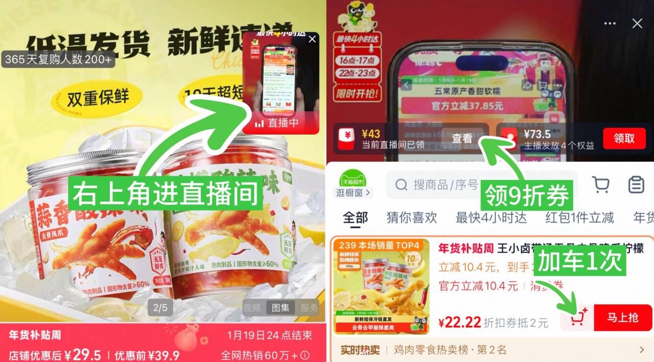 ①右上角进直播间 领9折券