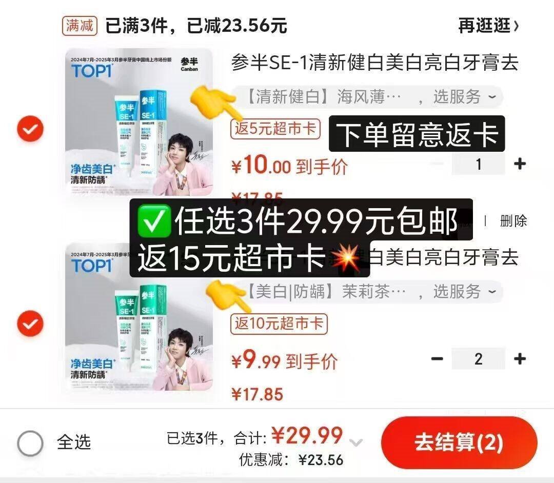 参半牙膏炒底 参半 SE-1清新健白牙膏180g 任选3件实.付29.9亓自营包邮好单发报员2026年01月15日 07:420举报 ——参半牙膏炒底——参半 SE-1清新健白牙膏180ghttps://u.jd.com/EOvCUD1https://u.jd.com/EOvLLOv任选3件实.付29.9亓自营包邮*反15亓超.市卡 相当于14.9亓复制文案