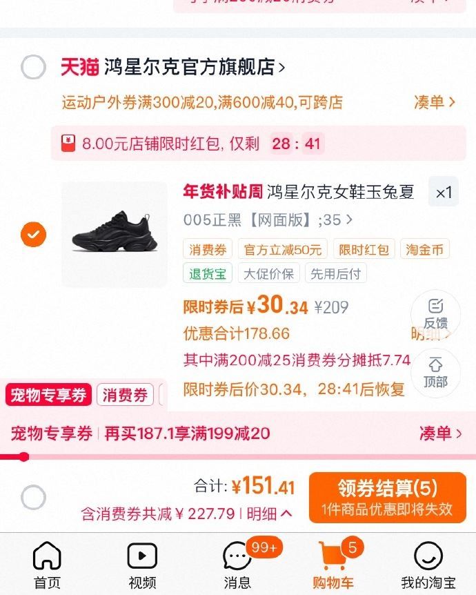 鸿星尔克 玉兔运动鞋 ,弹窗大额补贴,限时8元红包,淘金币足迹加购