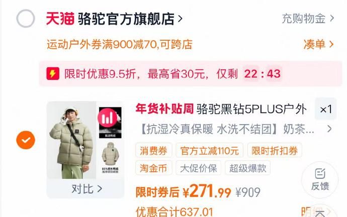 骆驼黑钻5PLUS户外羽绒服 257 弹限时立减更低