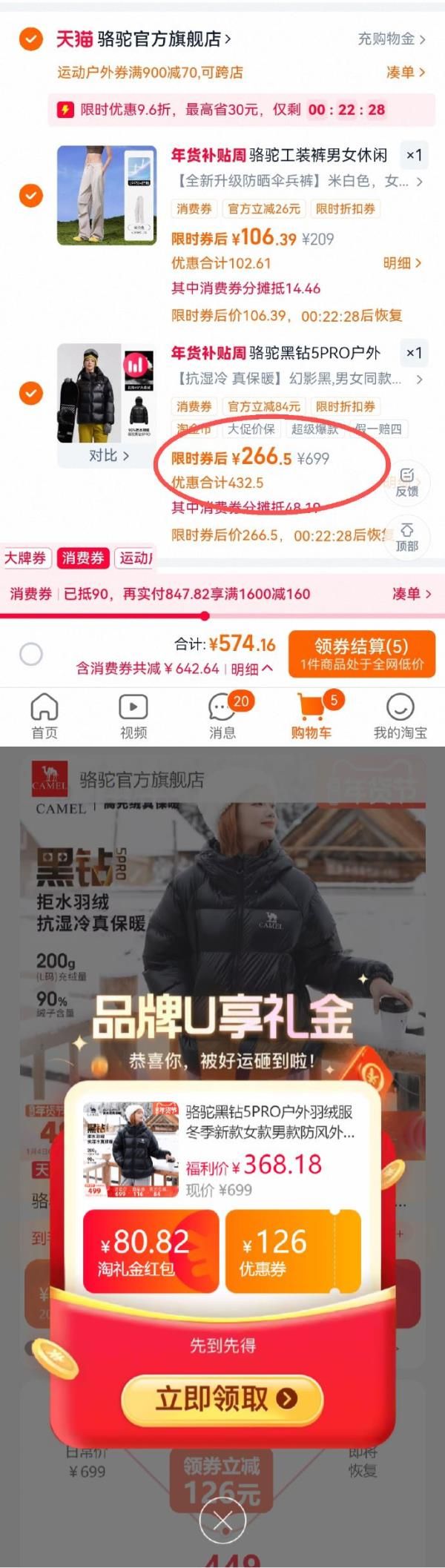 骆驼黑钻5PRO 羽绒服,弹窗大额补贴,限时9.6折券(如弹9.4折更低),淘金币足迹加购