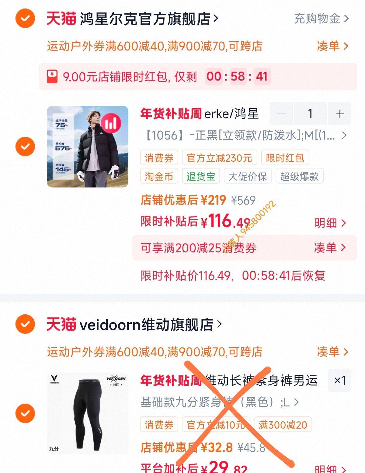 鸿星尔克男女立领羽绒服,下拉详情页从淘金币页加车到手116