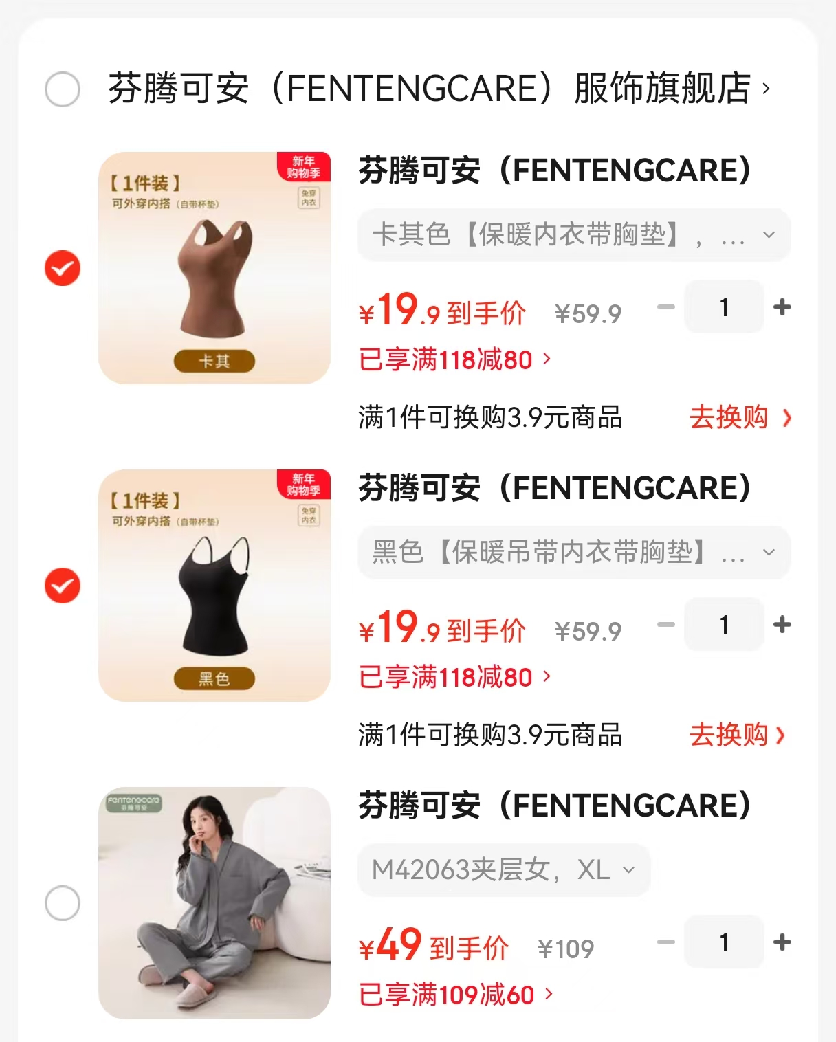 芬腾可安 秋冬德绒无痕保暖背心带胸垫,任选2件【39.9】