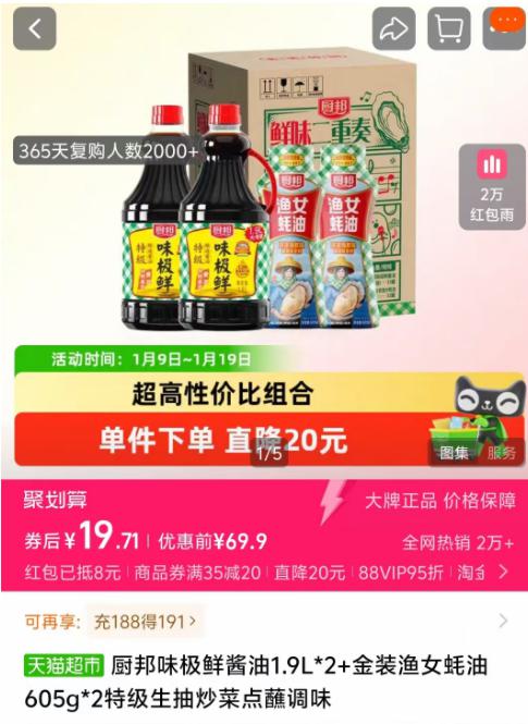 厨邦调料组合88vip19元.7 含酱油1.9L*2 蚝油605g*2 -好单发报员2026年01月15日 22:540举报 厨邦调料组合88vip19元.7含酱油1.9L*2 蚝油605g*2-需叠8亓福袋价格才成立厨邦调味料好价4块多/瓶家里做饭,刚需的,好价囤上https://m.tb.cn/h.7l4tXzn复制文案