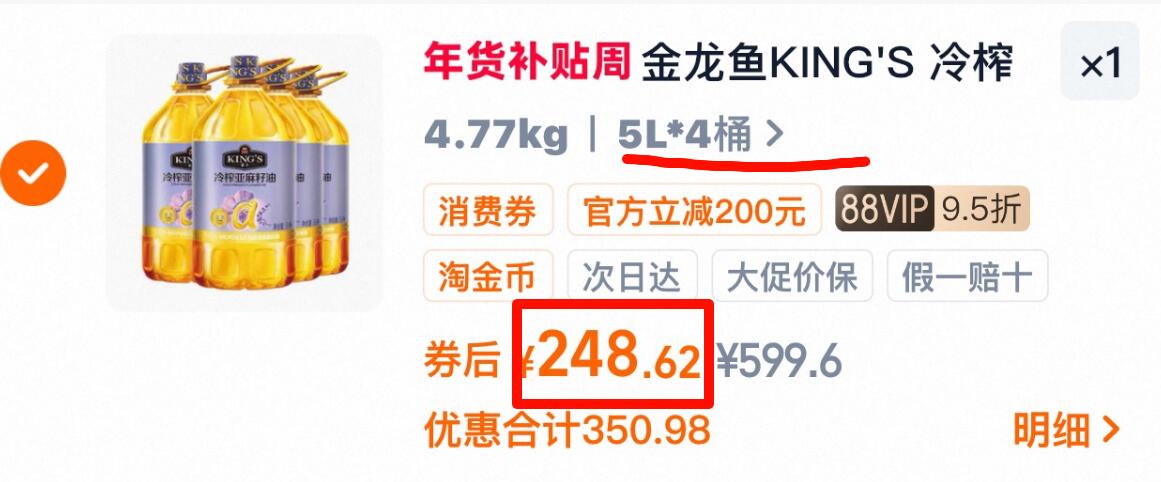 88vip248.6亓 折62亓/桶 叠惊喜虹包40亓 15淘金币 金龙鱼亚麻籽食用油5L*4桶好单发报员2026年01月16日 13:440举报 88vip248.6亓 折62亓/桶叠惊喜虹包40亓 15淘金币金龙鱼亚麻籽食用油5L*4桶https://m.tb.cn/h.7PEdrdB过年消耗量大 可以多囤一点啊复制文案