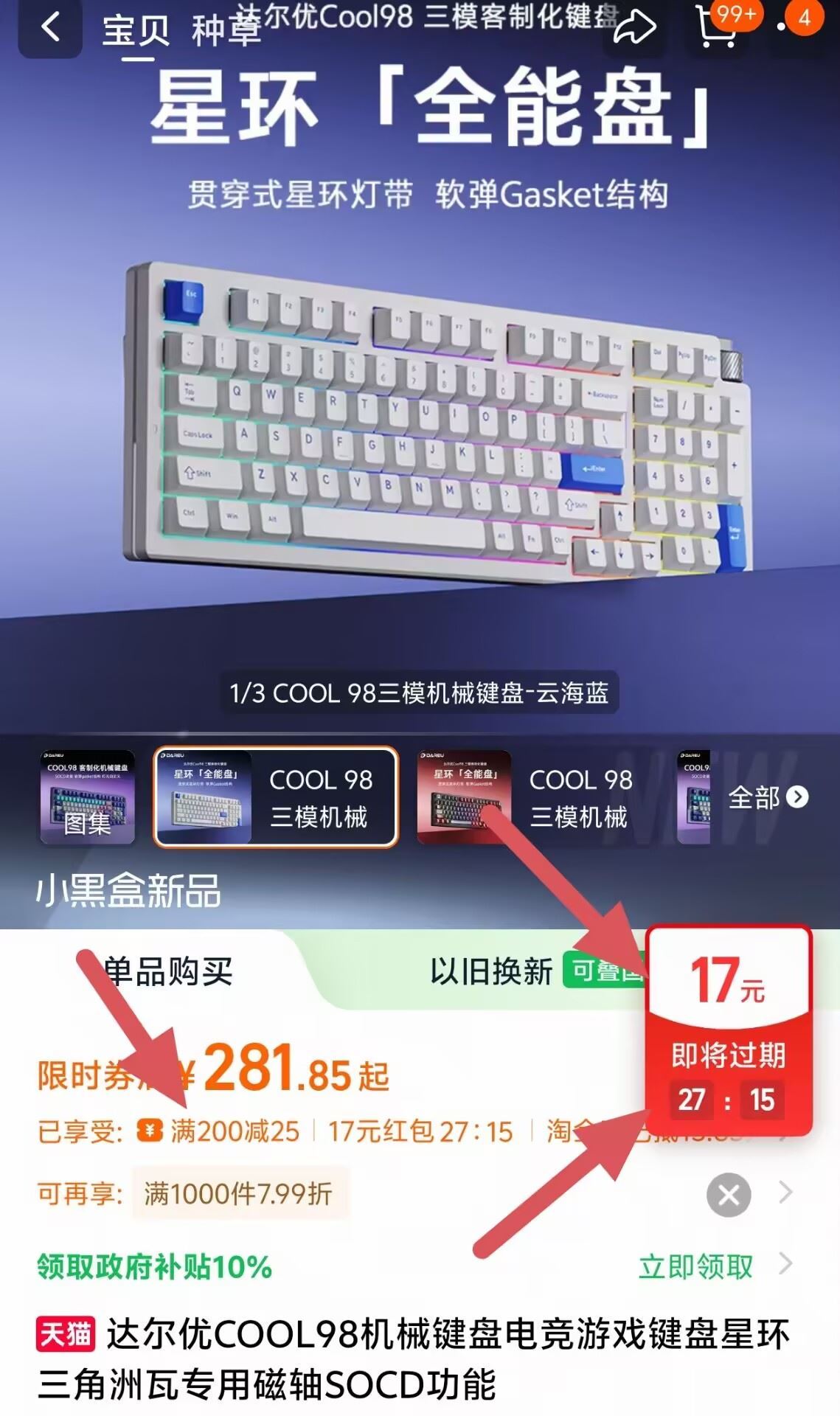 达尔优 COOL98 机械键盘,国卜叠券后【281.85】