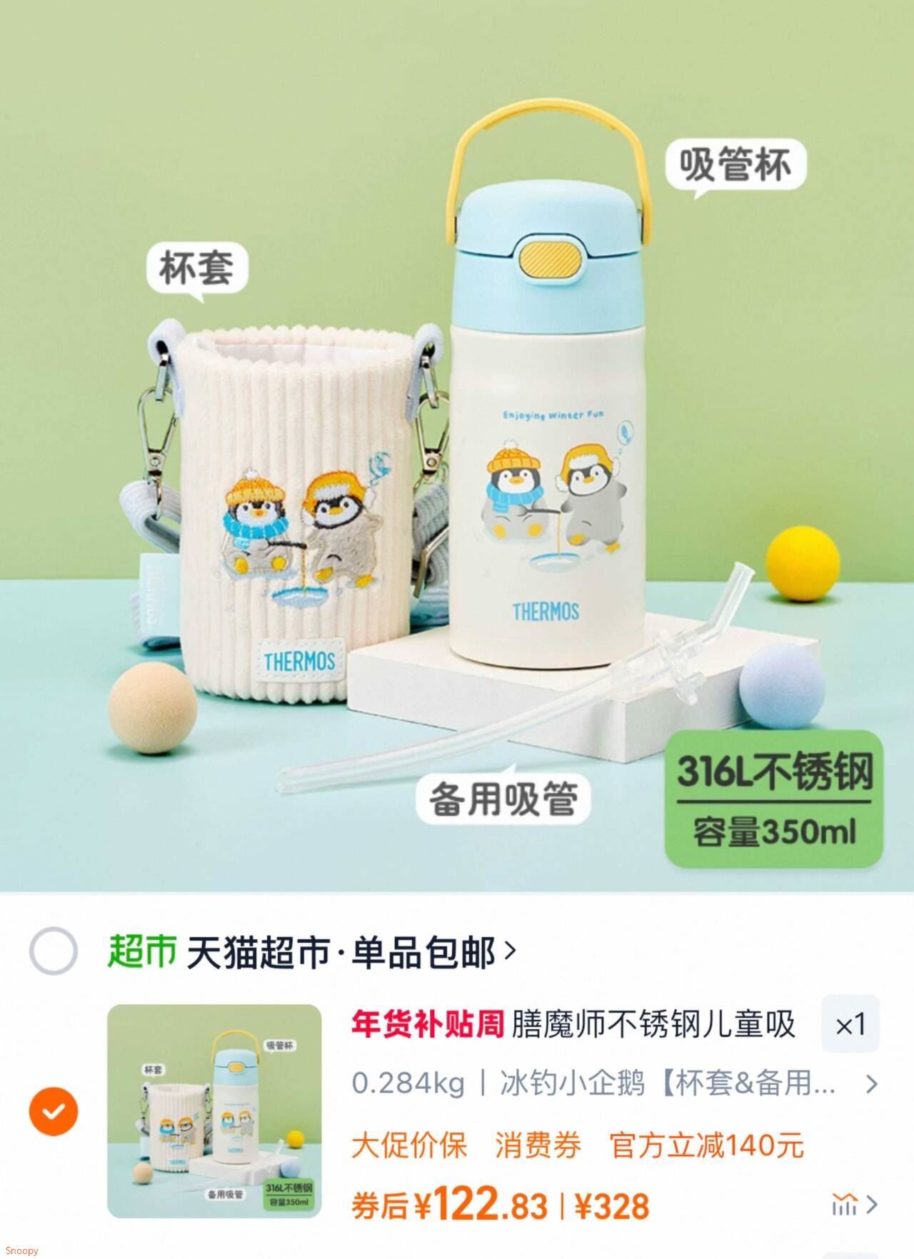 ②膳魔师儿童保温杯含杯套,拍小企鹅选项!淘金币频道加购,凑单200-25消费券付122.8元!