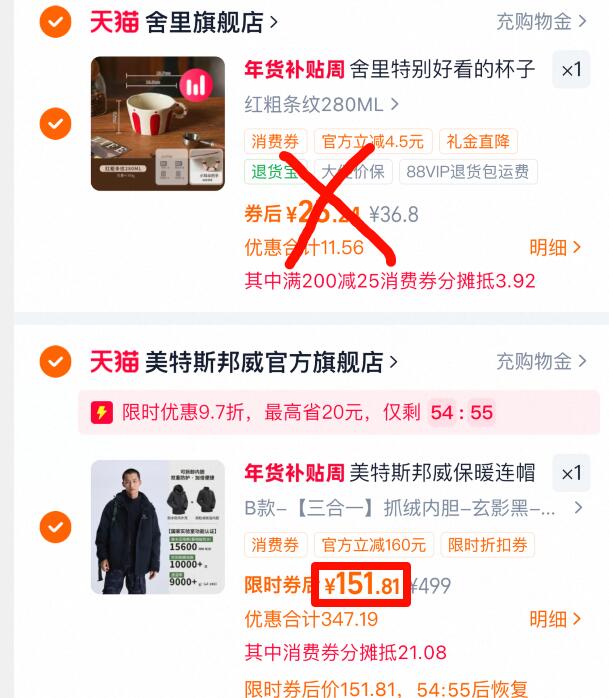 3、凑单商品加购 1 件 一起付款然后退掉凑单