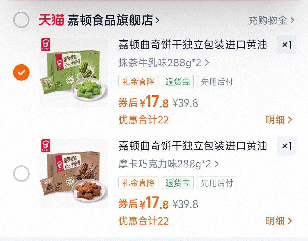 嘉顿黄油小曲奇饼干2口味 17.8288g*2盒,折8.9/盒好单发报员2026年01月17日 16:480举报 嘉顿黄油小曲奇饼干2口味17.8288g*2盒,折8.9/盒https://m.tb.cn/h.7OMEOmn复制文案