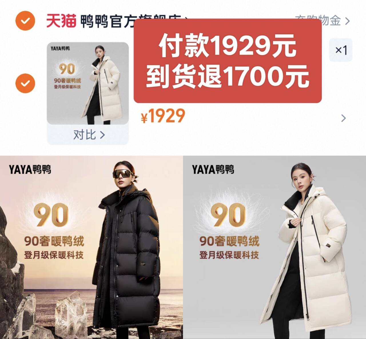 229元到手,过膝长款的 鸭鸭羽绒服,拍下1929元 收货后,申请仅退款“退运费”