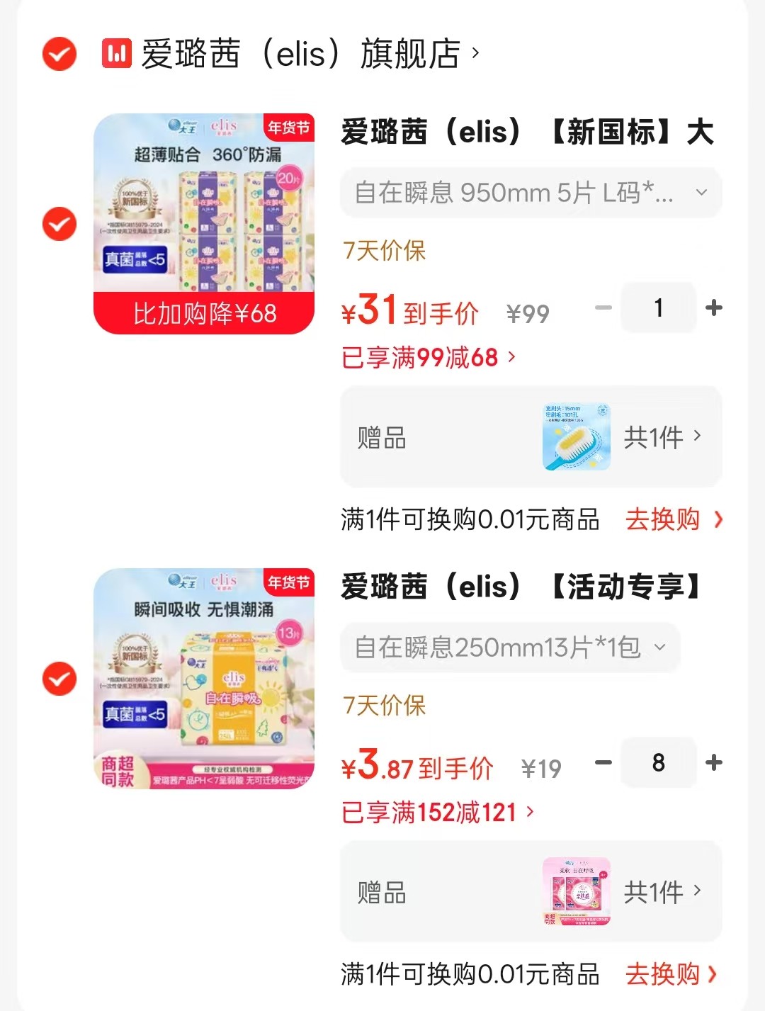 爱璐茜 (elis)100%优于新国标大王系列卫生巾,任选8件【31】赠4片卫生巾