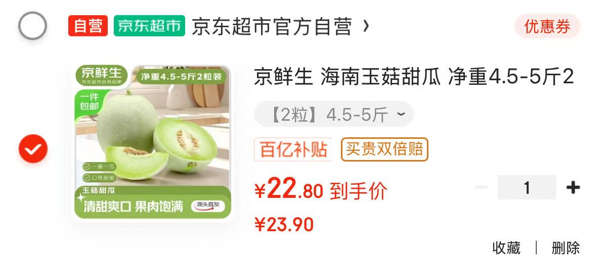 京鲜生 海南玉菇蜜瓜 净重4.5-5斤2粒装 【22.8】