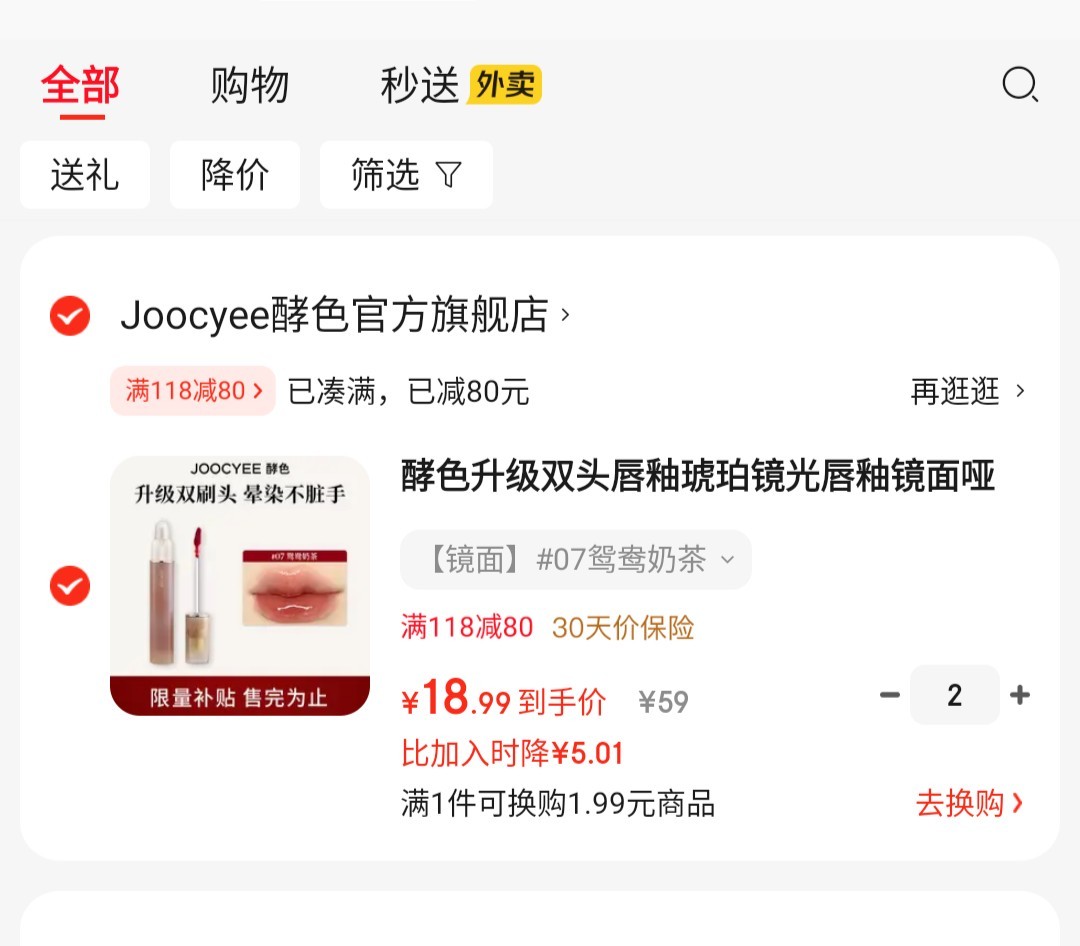 酵色 升级双头唇釉琥珀镜光唇釉 #07鸳鸯奶茶,任选2件【33.8】