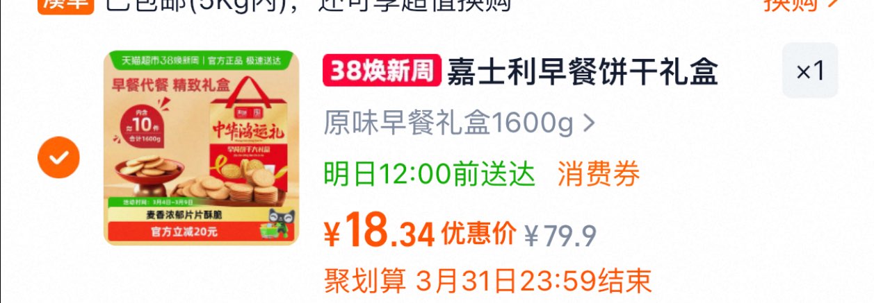 嘉士利 饼干礼盒1600g 金币页面加购凑后19.7 湊单好单发报员2026年03月04日 12:580举报 嘉士利 饼干礼盒1600g金币页面加购凑后19.7https://m.tb.cn/h.iXXkziX湊单https://m.tb.cn/h.i1Zavv4复制文案