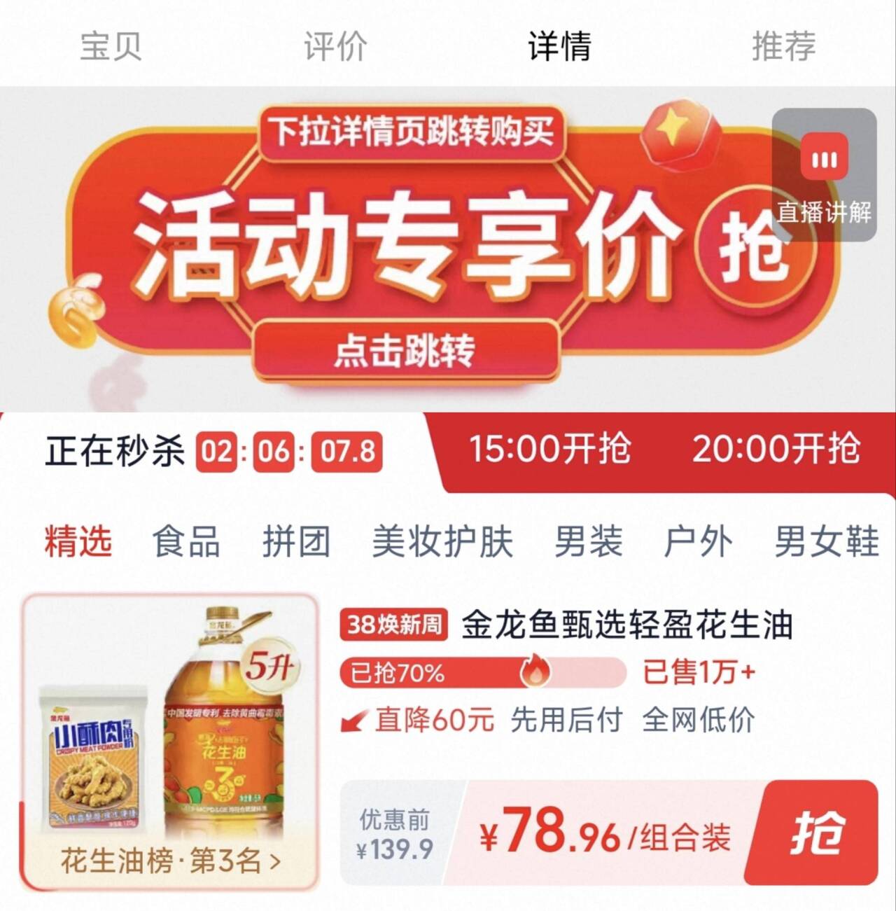 金龙鱼花生油5L 小酥肉 下拉详情拍78元.9组合好单发报员2026年03月04日 13:170举报 金龙鱼花生油5L 小酥肉下拉详情拍78元.9组合https://m.tb.cn/h.i1MZrSe复制文案
