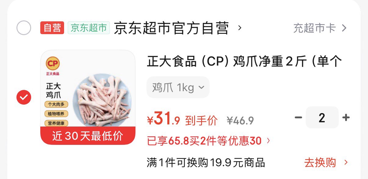 正大食品 CP 鸡爪净重2斤 拍2件 叠2礼金63.8亓 折15.9/斤好单发报员2026年03月04日 20:050举报 正大食品(CP)鸡爪净重2斤拍2件 叠2礼金63.8亓 折15.9/斤https://u.jd.com/N1u9u81复制文案