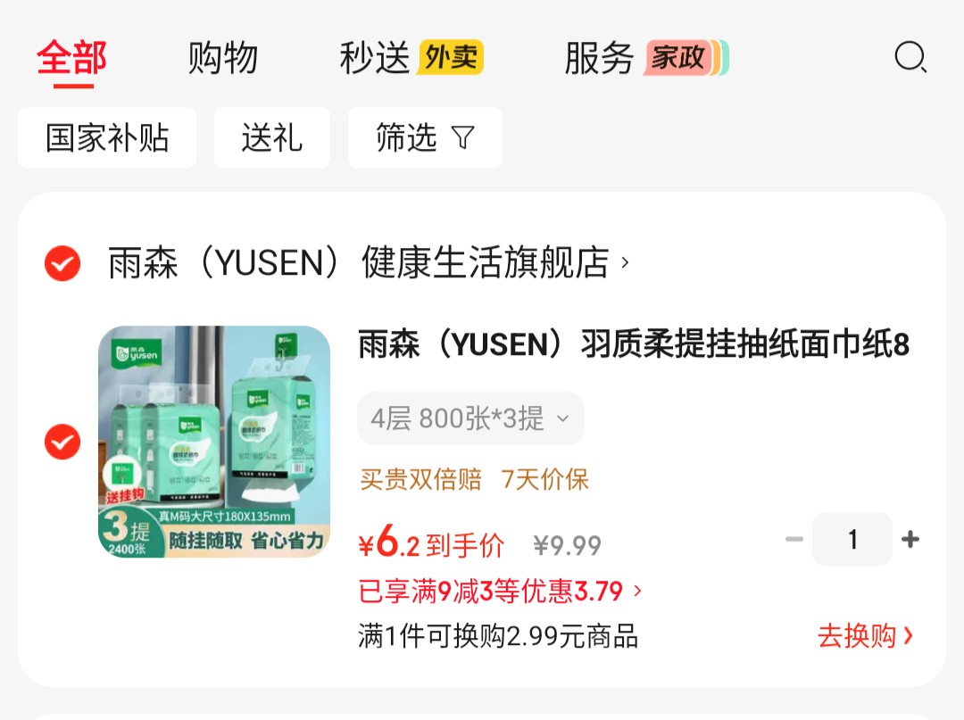 雨森 (YUSEN)羽质柔提挂抽纸面巾纸 4层加厚 800张*3提【6.9】