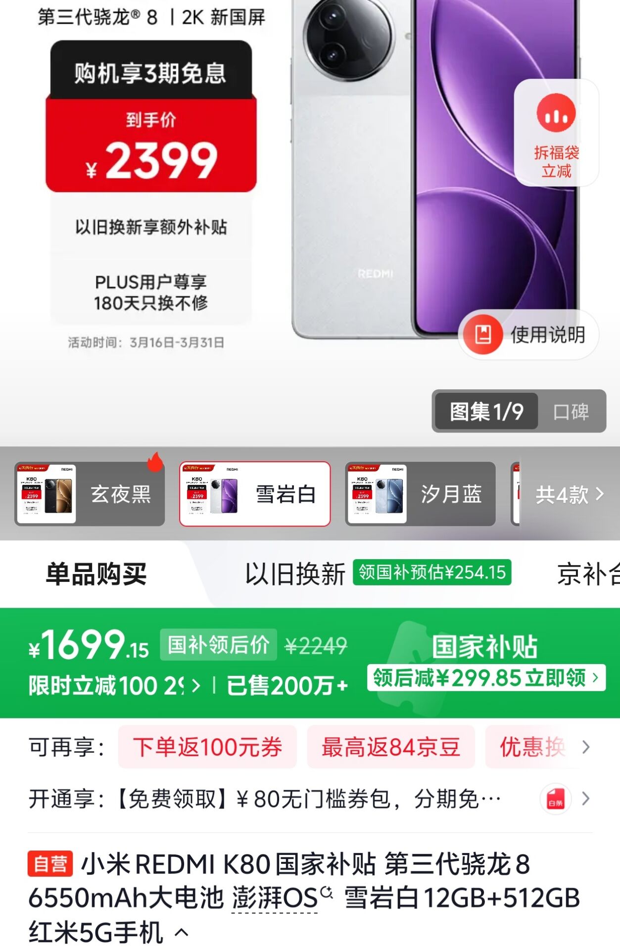 小米 REDMI K80手机12 512GB 第三代骁龙 8 6550mAh电池 1699元好单发报员2026年03月30日 15:040举报 小米 REDMI K80 手机12 512GB 第三代骁龙 8 6550mAh电池,部分号弹100无门槛,到手1699https://u.jd.com/c1EpwS3复制文案
