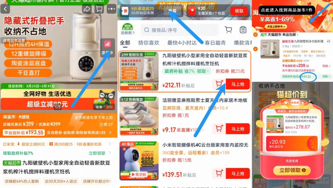 ③右上角进直播间领9折券