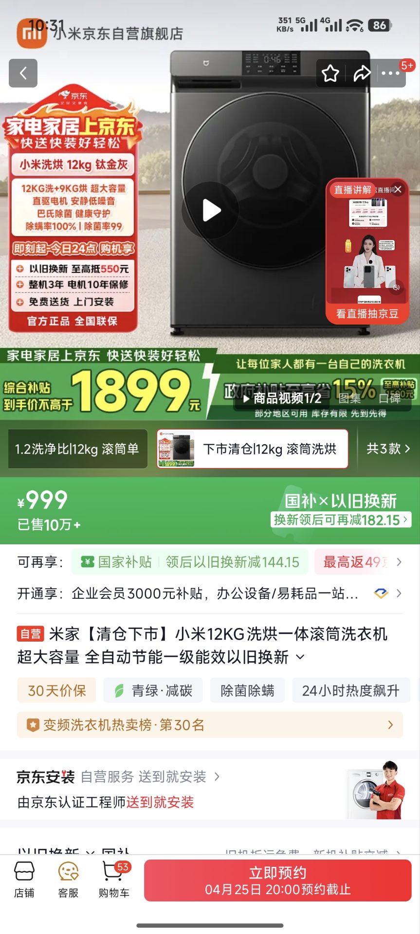米家小米12KG洗烘一体滚筒洗衣机 999元