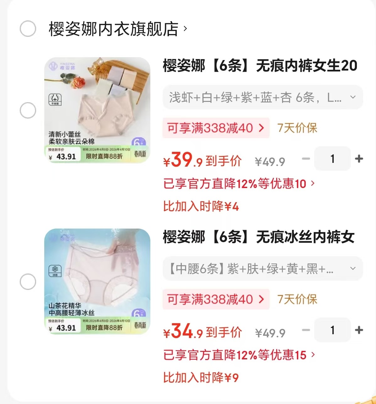 樱姿娜 无痕冰丝内裤女 6条【34.9】